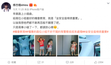 修杰楷说,“给两位小妞最好的机会教育,就是‘坐安全座椅很重要’,以后我想他们都不敢再百般不愿意了吧。”聪明的爸爸在小车祸发生时,对孩子进行机会教育,告诉孩子们一定要乘坐安全座椅。