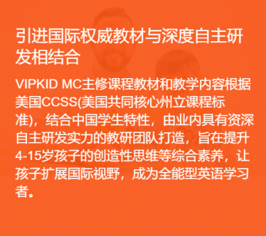 vipkid的主修课程体系是自主研发的参考美国核心州立的标准,英语全项进阶课还引进牛津的原版教材。vipkid的主修课以真人上课的,外教老师一对一的跟孩子互动,还有辅修课是不同主题的视频课程,让小朋友观看学习。