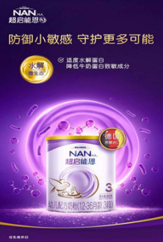 雀巢超启能恩3奶粉中含有宝宝日常生长所需的DHA、维生素C、钙铁锌等营养成分,营养均衡,配比科学合理,奶粉中还添加活性益生菌Bb-12,帮助宝宝提高肠道抵御能力,调节宝宝免疫系统平衡,降低宝宝对无害的外来物质产生过度反应。