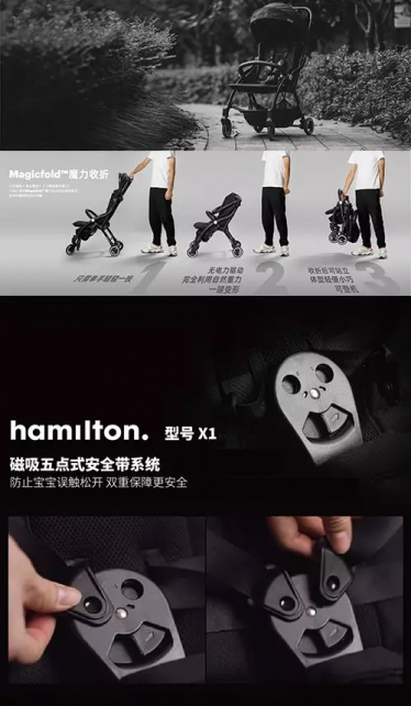 为了实现该目标,hamilton汉弥尔敦的产品十分注重创新和品质,研发设计的Magicfold™魔力推车,有着独创的Magicfold™自动收车和磁吸五点式安全带系统,在保证创新和高品质的同时,又恰到好处地平衡了安全性和实用性。