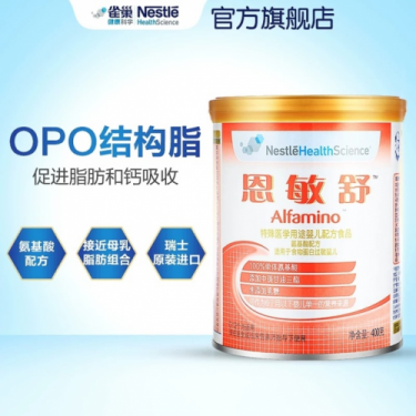 雀巢针对宝宝乳糖不耐受的问题设计了恩敏舒氨基酸奶粉。恩敏舒氨基酸配方粉是蛋白质构成为100%游离氨基酸的氨基酸类配方,无乳糖的配方更利于乳糖不耐受的婴儿,更低的渗透压在提高宝宝食用安全的同时,能够缓解宝宝乳糖不耐受的情况。同时,恩敏舒是唯一一款含有专利脂肪组合的氨基酸奶粉。配方中的脂肪内含有40%的OPO结构脂。相比普通的POP结构脂,40%的OPO结构脂能够促进宝宝对脂肪和钙的吸收。吸收足够的脂肪能为孩子生长发育提供充足的能量,有助于吸收钙质,促进骨骼健康发育,并且更接近母乳喂养的效果。