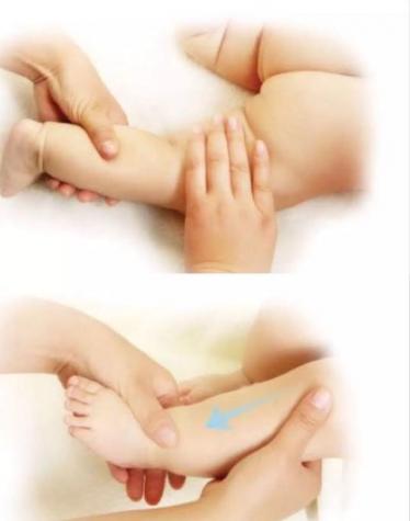 手法:从宝宝的大腿开始轻轻挤捏至其小腿,然后按摩脚踝及脚趾。