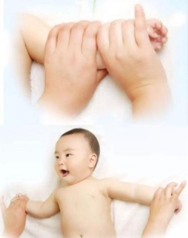 手法:双手先握住宝宝的一只胳膊,从上臂到手腕轻轻挤捏,再按摩小手掌和每根手指,换手方向同前。