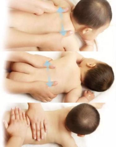 手法:双手平放婴儿背部,从颈部向下按摩,然后用手指尖按摩脊柱两边的肌肉,然后再次从颈部向脊柱下端迂回运动。