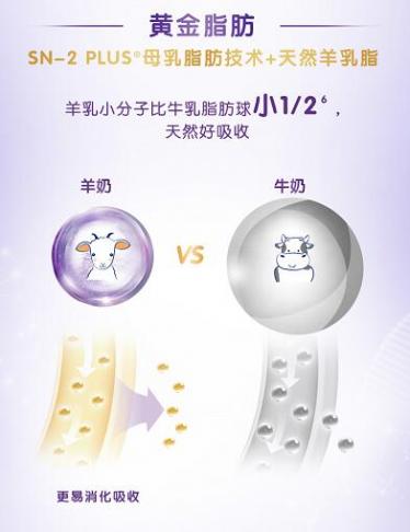 羊奶以其营养丰富、易于吸收等特点被视为乳品中的精品,羊奶中蛋白质、脂肪、矿物质含量都比较高,营养价值丰富。有专家建议患有过敏症、胃肠疾病、支气管炎症或身体虚弱的人群以及婴儿更适宜饮用。羊奶天然小分子颗粒,对比于牛奶来说脂肪球体积要小1/2,天然好吸收。有些小宝宝肠胃弱,吃奶粉会有吐奶、拉肚子的现象。其实宝宝有这样的表现就说明小宝宝肠胃吸收较弱或是选择的奶粉吸收不好。合生元羊奶粉还在好吸收的羊奶中添加了独家创新的SN-2 PLUS天然乳脂配方,更多的OPO含量,优化脂肪结构,减少钙皂的生成,软化便便,让本来就比较好吸收的羊奶更好吸收。更好吸收的羊奶粉让断奶变得更加顺利,延续天生亲和守护,小宝宝肠胃棒棒的~