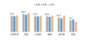 根据于<全国肿瘤登记中心2000-2010年的生存率统计>数据显示,我国儿童恶性肿瘤的整体5年生存率为71.9%,其中白血病、骨癌的生存率已高于70%,脑中枢神经系统肿瘤为69.9%,淋巴瘤为64.7%,肝恶性肿瘤为52%