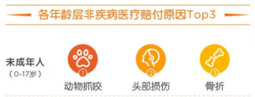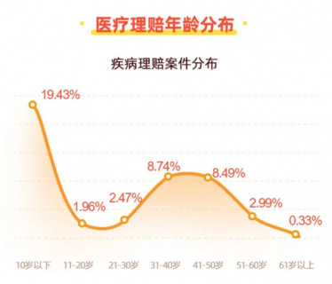 我们先说平时的小毛小病,根据中意人寿2020年年报中医疗险险的理赔数据中,我们可以看到10岁以下的儿童的理赔概率最高,达到了19.43%,也就是说10岁以下的儿童发生医疗风险的概率,相对于其他年龄段其实是更高的。