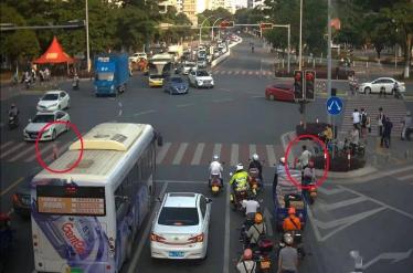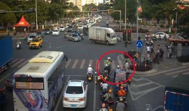 4月23日17时左右,江门交警一名铁骑队员经过胜利北路凤溪桥红绿灯等待红灯时,其右侧一名腿脚不利索的老人推着儿童小推车,带着一名小孩刚好走到此处准备过马路。