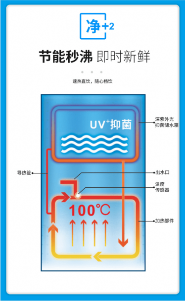 另外,净水器在安装后的使用过程中,机器内部也会有大量细菌滋生,国标对净水器的水质标准要求菌落总数≤100个/升即可,但细菌在水中大概20分钟就可繁殖一代,按此速度计算只要6个小时每升水的菌落总数就能达到惊人的2600万个。因此,仅仅满足出厂检测合格的净水机在实际使用过程中,仍然会有大量细菌滋生。而UV紫外线可以达到99.999%以上的杀菌率,只有配置末端UV杀菌,出水才能直饮。