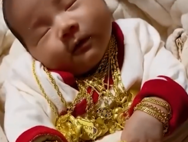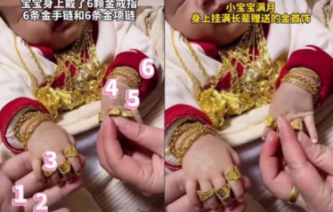 家里的亲戚朋友多了难免宝宝会出现视频中宝宝全身被金饰覆盖的场景,这不是在炫富,这是在表达着长辈对宝宝的宠爱与祝福。