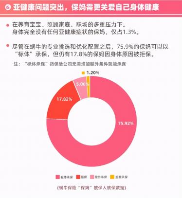 报告特别指出,不管是“职场妈妈”还是“全职妈妈”,在生活多重压力下,98.7%的保妈出现不同程度的亚健康症状,因身体原因被拒保的比例甚至高达17.8%。