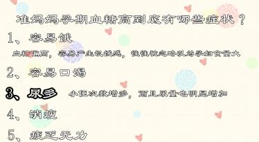 口渴,尿多,饿(不要以为是因为有了宝宝才胃口变大),消瘦等。