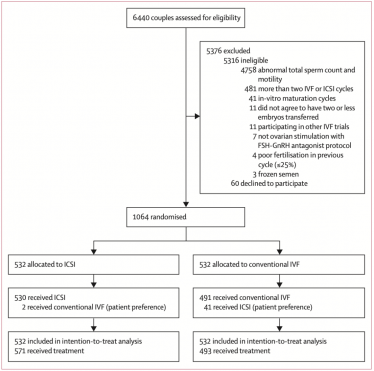 最终,5376对因为上述因素被排除,1124对入组并随机化。两组取卵子方案一致。取卵子当天获得新鲜精液样本,分别用于ICSI组(532对)和常规IVF组(532对)。