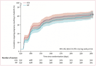 文章的分析是依据原始的随机化分组来进行的。ICSI组和常规IVF组最终活产率分别为35%和31%(p=0.27),妊娠失败率分别为5%和6%(p=0.60),差异均不显著。
