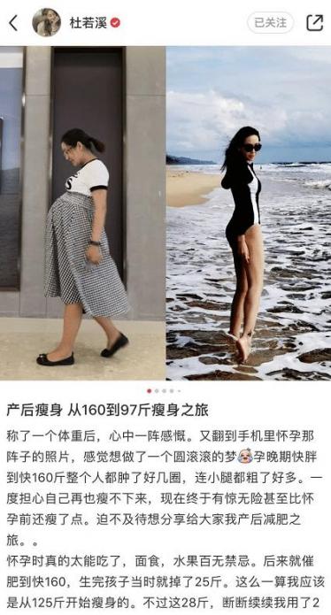 7月29日晚,演员杜若溪更新社交平台,分享了自己自2018年1月生下女儿后,用了2年多的时间从160斤瘦到97斤的瘦身经验。
