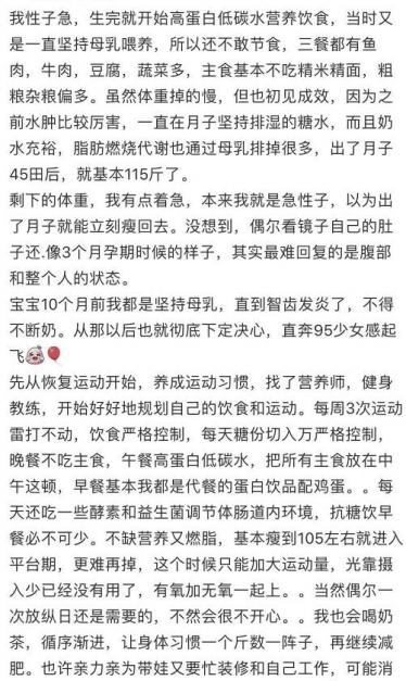发小作文分享瘦身经验的杜若溪,文字同样诚恳,杜若溪透露道:“怀孕胖到160斤的她,生完孩子当时就掉了25斤,而这么算下来,自己应该是从125斤开始瘦身。而对于她来说从125斤瘦到现在的97斤,减掉28斤的她断断续续用了2年才算减下来。”