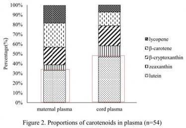 如上图所示,血浆中胡萝卜素类中比例最高的部分就是叶黄素了。而且,非常值得关注的是,脐带血营养群(cord plasma)的叶黄素比例要远高于怀孕女性血液中的叶黄素,这反映出叶黄素本身会在脐带血中呈现一个聚集放大过程。