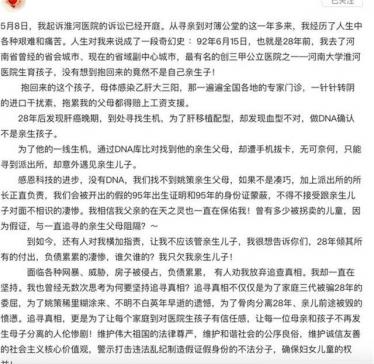 5月12日,郭威生母许敏发文描述了一年多来自己的心路历程,她将之称为“奇幻之旅”。许敏表示自己28年来对于养子姚策精心照顾,倾情付出,没想到天不由人,姚策还是患上了重大疾病,为了提前做好换肝的准备,进行肝移植配型,却发现孩子身世之谜。为了姚策一线生机,许敏夫妇通过DNA库比对锁定了姚策的亲生父母,又意外遇到了亲生儿子,只能说一切都是最好的安排。许敏特意在文中感谢DNA技术,感谢派出所所长的正直负责,若非知晓郭威年龄的所长为他们指引方向,他们可能就会因95年的假证错过亲生儿子。