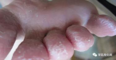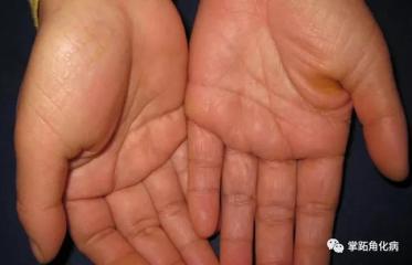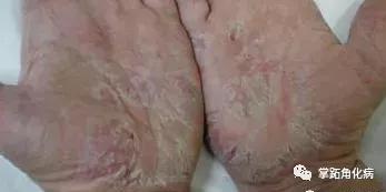 5、进行性掌跖角化病:初期为婴儿期,直到30-40岁才会中止。表现为从掌跖逐步发展至于足侧缘甚或背侧,臀和腿部也可有不规则的斑块。