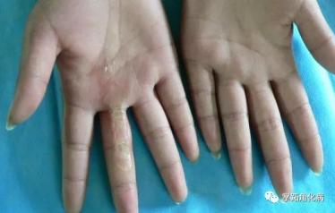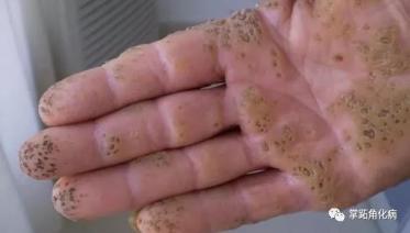 2、点状掌跖角化病:多发于15-30岁之间。呈圆状不规则分布于掌趾部位,可自动脱落。伴有指(趾)甲的营养不良,纵裂、甲沟弯或脱落。