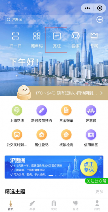 在支付宝/微信中搜索“随申办”或点进随申办市民云APP,进入后点击【亮证】