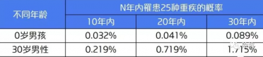 同期对比来看,10年内,成人得重疾的概率是男孩的6.9倍,20年内是17.6倍,30年内是19.2倍!