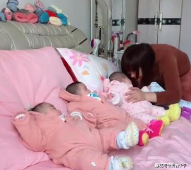 躺在床上的三个宝宝,其中有两个宝宝穿的是同款同颜色的连体衣服,还有一个宝宝穿得却是不同颜色的,这也方便家人快速分辨出三胞胎宝宝,毕竟三个宝宝的长相都差不多,目前只能通过这样的办法来区分。