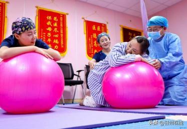 5月26日,河西学院附属张掖人民医院产科的党员和团员医护人员正在指导孕妇用分娩球减轻心理压力进行导乐分娩。