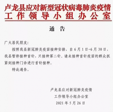 卢龙 6月1日-6月30日暂停接种首针、只接种第二针
