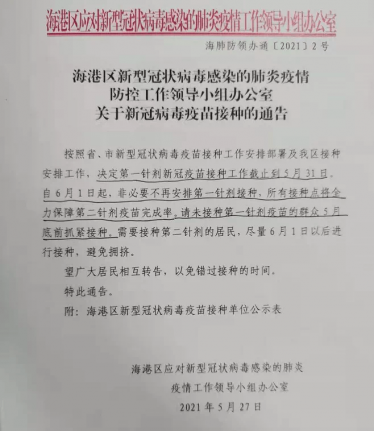 海港区 第一针接种截止到5月31日6月1日起,非必要不再安排第一针接种所有接种点将全力保障第二针疫苗完成率请未接种第一针的群众5月底前抓紧接种需要接种第二针的,尽量6月1日后接种