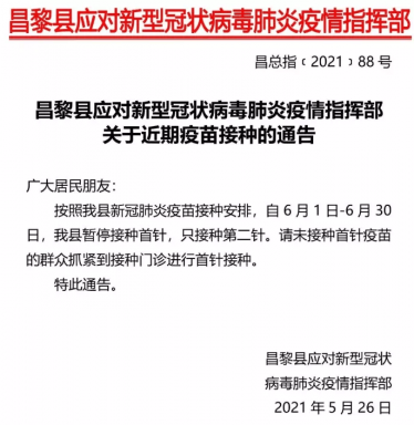昌黎 6月1日-6月30日暂停接种首针、只接种第二针