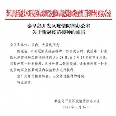 截至发稿前海港区、开发区、昌黎、卢龙已通知,即将暂停新冠疫苗第一针接种,暂停时间略有不同。