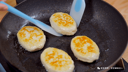 小火煎到小饼底部定型,翻面。火不要太大,这里如果对自己不太有信心的姐妹,可以做得稍微薄一点、小一点,更好熟。