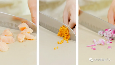 鸡胸肉、胡萝卜和圆葱切成小丁。我用的鸡胸肉,如果想要更嫩一点的,可以换成鸡腿肉或者是家里现成的其他肉类。也可以加上其他宝宝喜欢的蔬菜,像是西蓝花什么的。