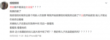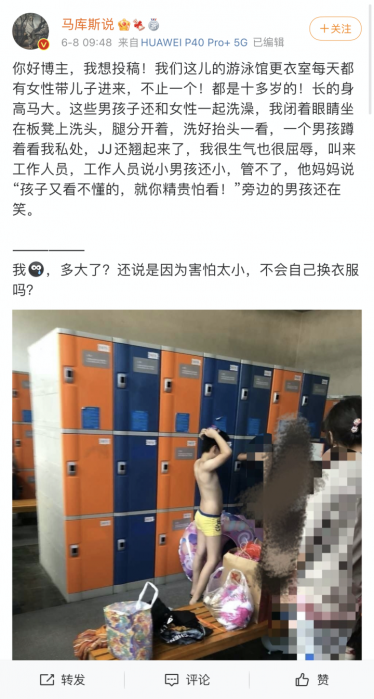 比这更过分的是,最近有网友抱怨说游泳馆的女更衣室里,总有人带十多岁的男孩进来,跟女性一起洗澡,男孩甚至会做一些成人化的举动。