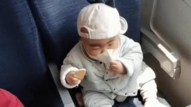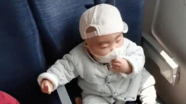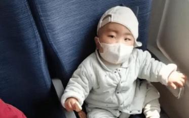 只见宝宝自己坐在一个座位上,姿势很是潇洒帅气,肉嘟嘟的脸上戴着口罩。