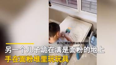 这位妈妈拍视频的时候,弟弟正一脸无辜的拿着一个碗在厨房掏面粉,还把面粉撒的厨房、客厅,房间到处都是。镜头一转,哥哥正跪在满是面粉的地上,手上还在用面粉堆玩具玩。看到这样的场景,这位二胎妈妈一边哭一边喊“我真的要崩溃了,打孩子吧事情已经发生了,不打孩子吧自己心里又憋屈,这就是在家带孩子的心酸”。
