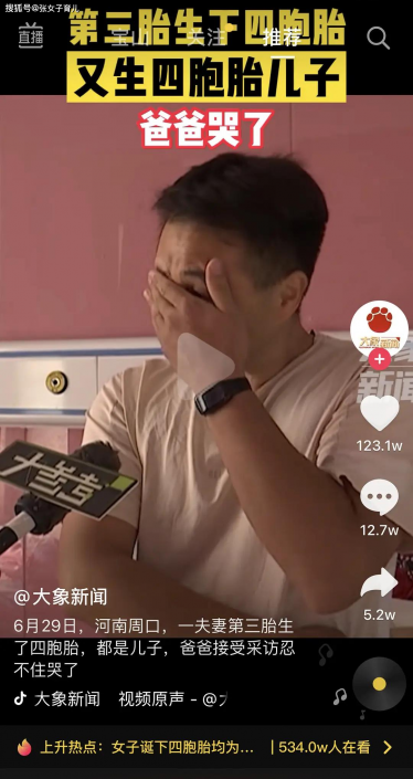 因为三胎居然生下了4胞胎,并且都是儿子,宝爸在接受采访的时候,留下了复杂的眼泪,并且声称这都是财富。网友对此的反应很真实。