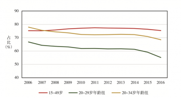 如图1所示,2006年以来中国生育旺盛期女性已婚比例持续下降,20-29岁女性的已婚比例从2006年的66.8%降至2016年的55.2%,20-34岁女性的已婚比例从77.9%降至68.5%,二者均下降了10个百分点左右。