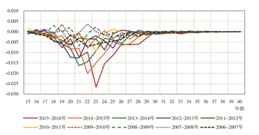 图4. 已婚比例对总和生育率变动的影响。注:图中每一点代表在该年龄上已婚比例变动引起年龄别生育率变动的值。
