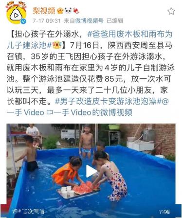 前几天微博上刷到一个一个视频,说一个爸爸因为担心4岁的儿子在外游泳溺水,用废木板和雨布在家自制了一个泳池,仅花了85块钱,最多一天有二十几位小朋友来玩。