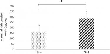母体皮质醇水平与婴儿性别的统计结果如下图所示:研究结果表明,怀孕前三个月头发中皮质醇的水平,似乎与婴儿的性别有关。孕妇皮质醇水平更高(即妊娠期压力更大),更可能生女孩。