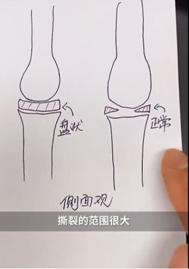 医生说,孩子刚来时走路的姿势就不太好看,一扭一扭的,连正常的下蹲也做不到,是典型的膝关节盘状半月板损伤撕裂,撕裂的范围很大,需要及时手术。
