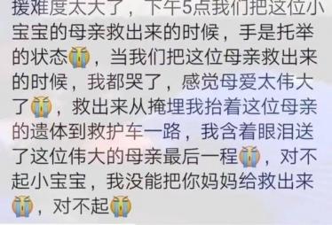 他在朋友圈写道:“当我们把这位母亲救出来的时候,我都哭了,感觉母爱太伟大了,我抬着这位母亲的遗体从掩埋的地方到救护车这一路,我含着眼泪送了这位伟大的母亲最后一程,对不起小宝宝,我没能把你妈妈给救出来,对不起”