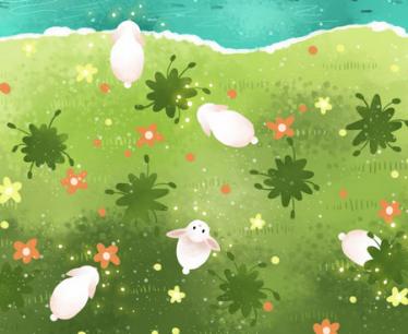 小白兔在草地上蹦蹦跳跳,一会儿看看花,一会儿采采蘑菇,玩得真高兴啊!