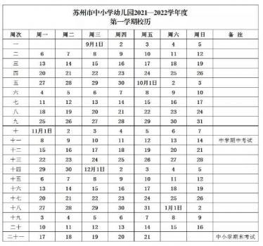 苏州市中小学幼儿园2021—2022学年度第一学期校历
