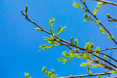 榕樟树的枝干上,嫩绿的新芽羞答答地探出自己的小脑袋,打量着这个五彩缤纷的世界,它们的到来给榕樟树增添了一番生机。