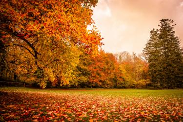 香樟树是常青树。我抬头望去,它那满树的叶子几乎全是绿色的,只有几片红色、黄色的叶儿零星地点缀其间。一阵爽人的秋风吹来,香樟树枝摇叶摆,几片不经风吹的叶片像小伞兵似的飘然落下,片片都平安落地。这时我才发现地上满是棕红的樟树叶,我就踏在它们铺成的红地毯上。这满树的绿和满地的红相映成趣,令人浮想联翩。