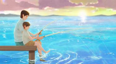 太阳快落山了我的桶里一条鱼也没有,而爸爸的桶是满满的。爸爸走过来对我说:“无论做什么事情都要有耐心”。于是我和爸爸高高兴兴的回家了。