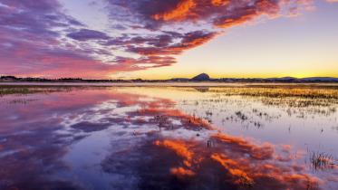 不知不觉中,太阳也钻了出来,先是一点金光从水面升上来,然后越来越大,显出一个椭圆形,光辉四射,大地笼罩在祥和中。